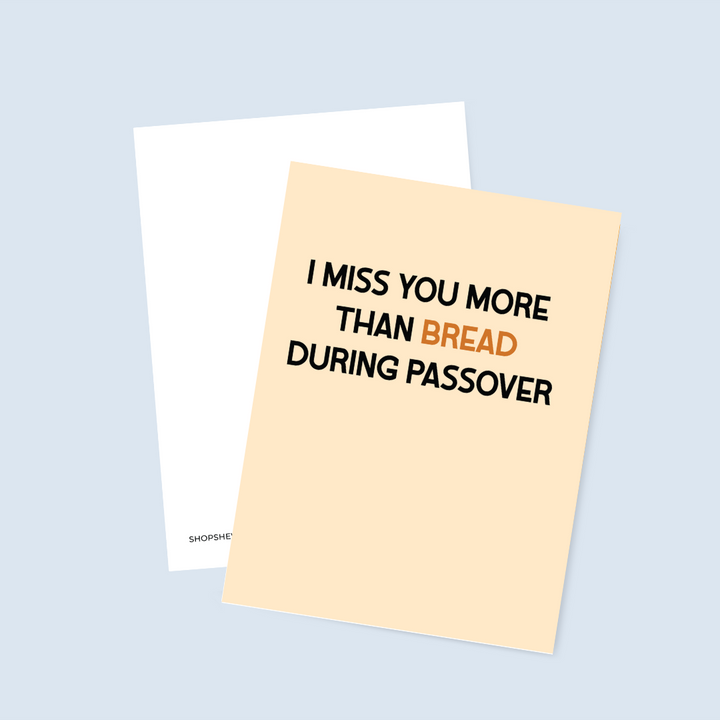 Missing someone this much should be illegal—like bread on Passover. A perfect card for long-distance love, friendships, or anyone you’d sneak a challah for. Funny, relatable, and perfect for Passover or year-round laughs.